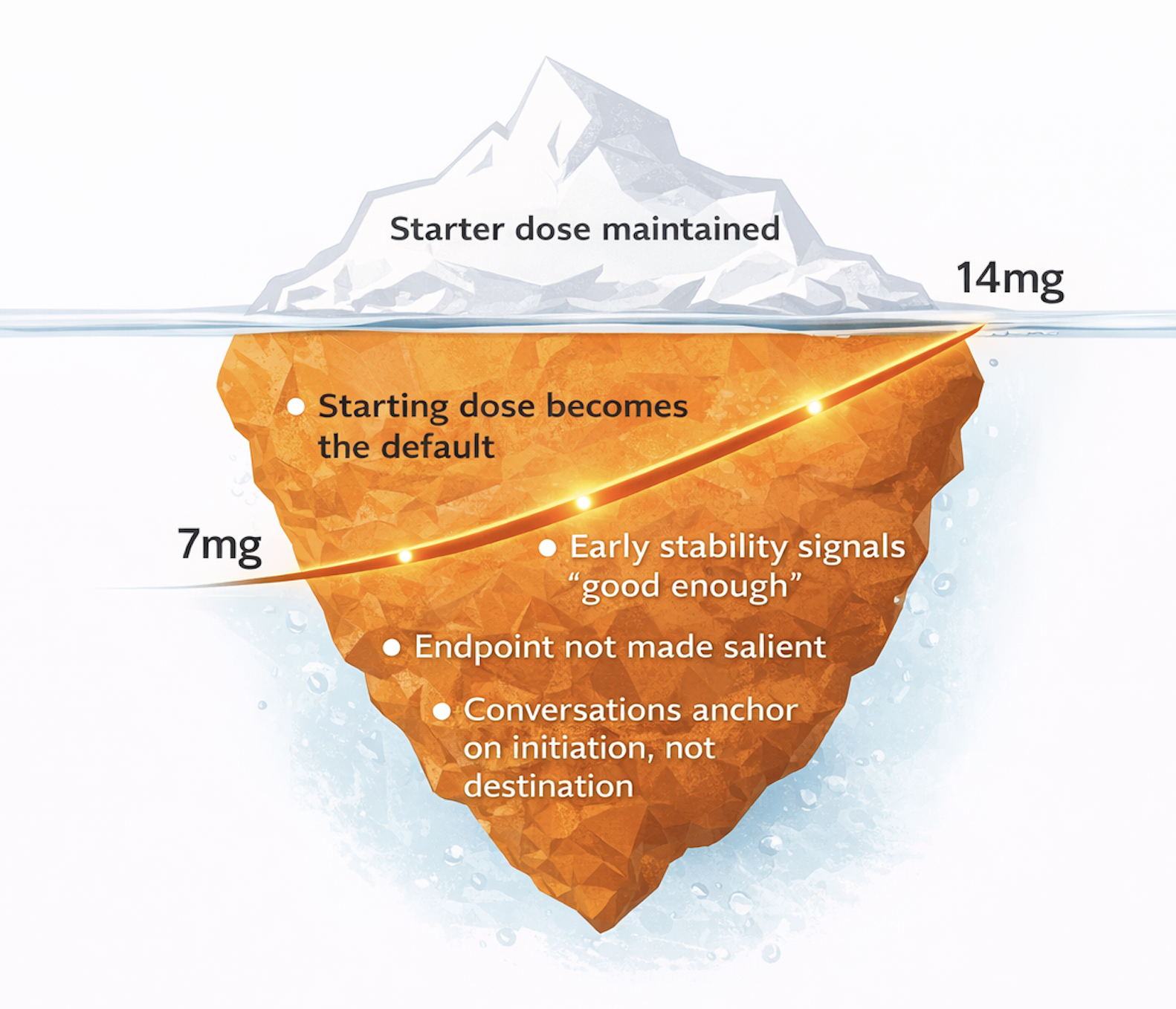 The starting dose becomes the psychological default. Without a clearly framed destination, the starting dose feels like an endpoint rather than a step.